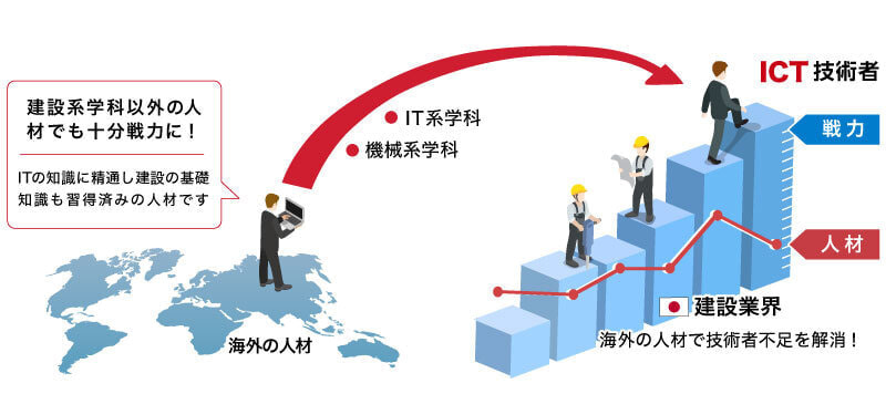 - ICT導入には建設業界全体にIT・ デジタル系の人材が不可欠!そこで!外国籍の技術者がi-Constructionの推進力となります!